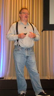 Anthony Wood, CEO of ROKU, gave the opening keynote on the first day of the SMPTE conference (23 October 2012).   Anthony is a successful and charming Silicon Valley entrepreneur, complete with the handyman uniform of sneakers, worn jeans, and suspenders (see photo).  The term ROKU comes from ‘six’ in Japanese, by the way.  It was Anthony’s sixth company.