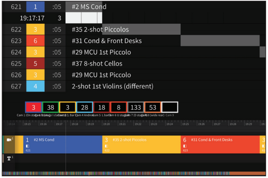 The pre-production work can encompass video roughly shot on any device, audio clips, lyrics, and scores. The vision cues for each camera and crop can be added to the timeline to create a full run-down. The camera operators receive a digital cue card in the provided app, which not only gives the camera and preset information, but also a countdown for the length of time each shot lasts for.
