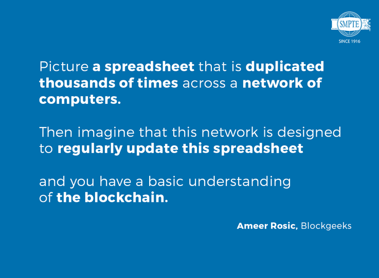 Some information in this blog was derived from the September Motion Imaging Journal Article, ‘Blockchain in Media — A True Calling?’ To read it, get your hands on this month’s journal!