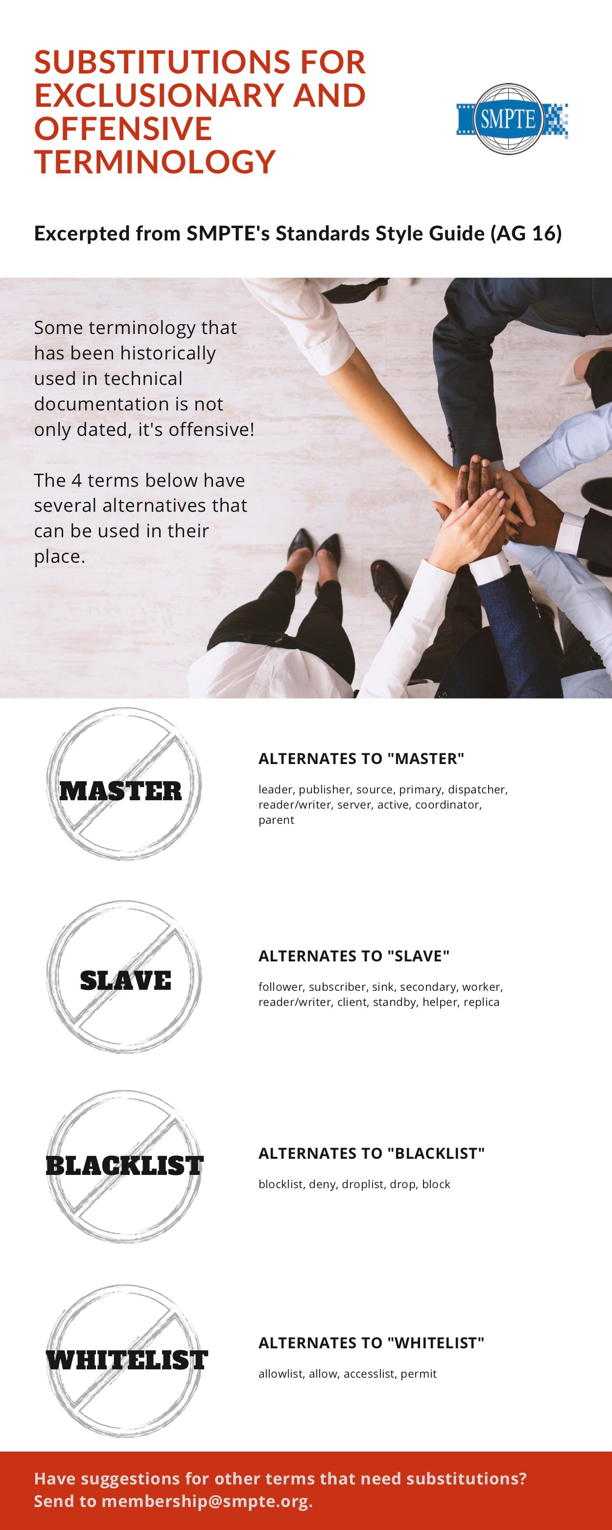 I am delighted to share that the SMPTE Standards Community has recently updated one of its Administrative Guidelines (AG 16) which governs the style of standards and engineering documents. The guidelines identify four offensive terms and provides a multitude of substitutes to use in place of each.