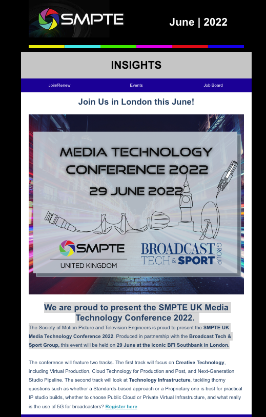 The Society of Motion Picture and Television Engineers is proud to present the SMPTE UK Media Technology Conference 2022. Produced in partnership with the Broadcast Tech & Sport Group, this event will be held on 29 June at the iconic BFI Southbank in London.