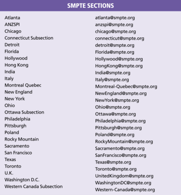 SMPTE Sections provide a local network. They encourage business and personal connections that benefit both individual and corporate members. Local Sections enable others with similar challenges to commiserate and solve problems, saving time, money, and frustration.