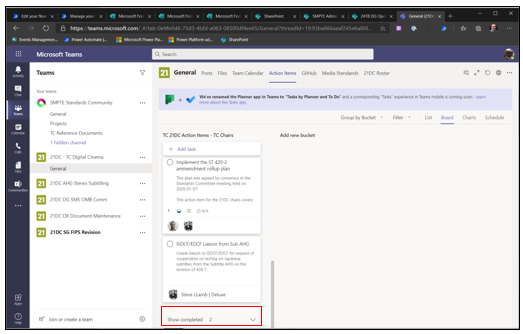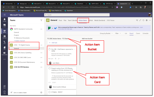 All open Action Items on the SMPTE OLC were carried over to the new SMPTE SKN. Like we did for projects, we used Microsoft Planner to facilitate the implementation of action items. Each team on the SMPTE SKN has a tab for action items in the “General” channel for that group. The Microsoft Planner board has one card for each action item and one bucket for all action items.