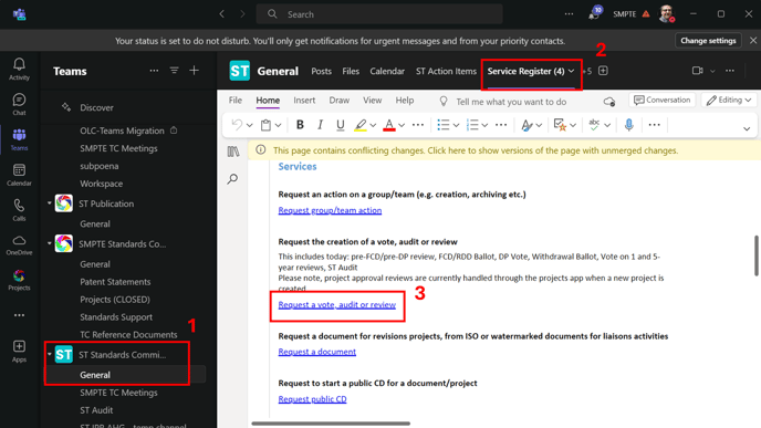 Please request a 2-week Project Review once the project is created and you feel ready to submit it to the TC and ST. To do so go to the Service Register which is attached to the tab bar in the General channel of the Standards Committee (ST) Team on the SKN.