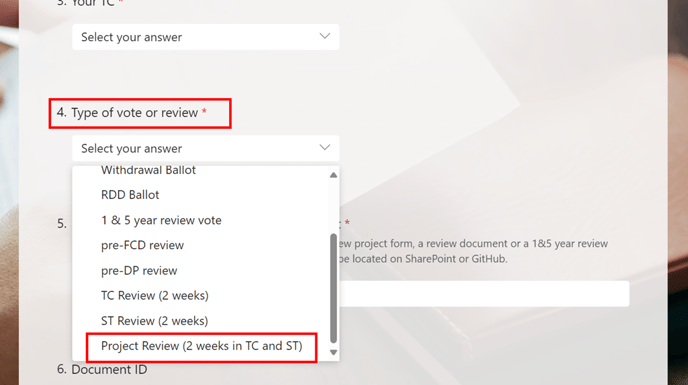 Fill out the "Request a Vote or Review" form that opens up and make sure to select "Project Review (2 weeks in TC and ST) under "Type of vote or review". Click on "Submit" once you are done filling the form. Make sure to fill in all mandatory fields.