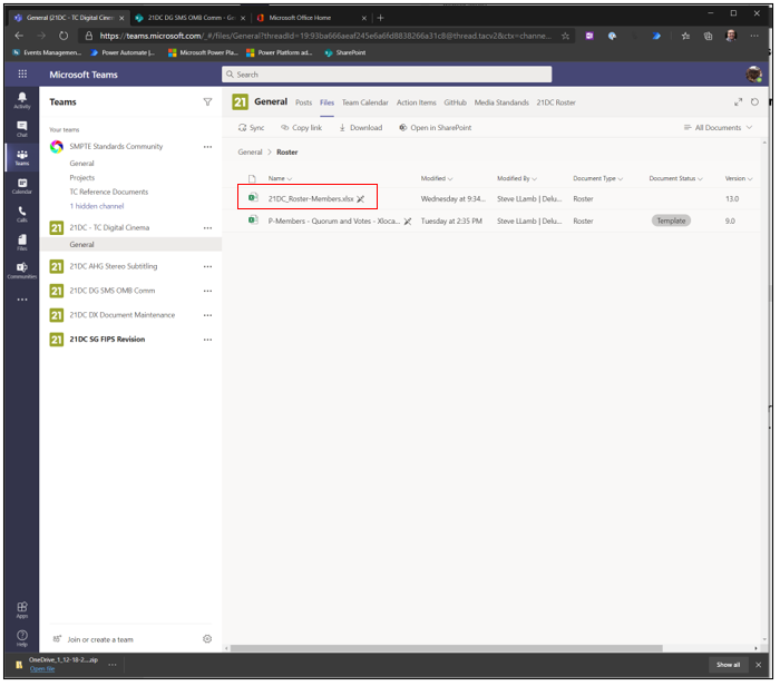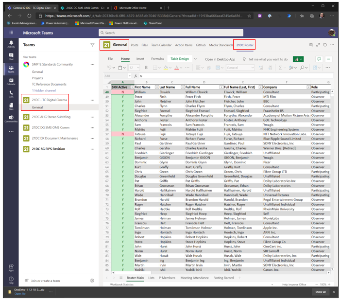 The maintenance of TC rosters including the recording of member roles (P and O-Members) will be facilitated through an Excel spreadsheet for the time begin. This will accommodate a speedy migration to the SMPTE SKN and give SMPTE HQ time to improve the experience of membership record keeping for TC’s. The Excel spreadsheet will also allow for the recording of meeting participation and voting behavior and with that the calculation of eligibility of a member to become or remain a P-Member (per SMPTE Standards OM). The spreadsheet is accessible through a tab in the “General” channel of a TC.