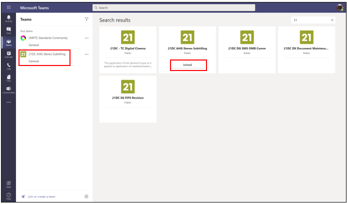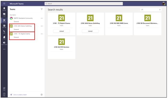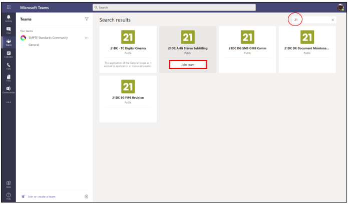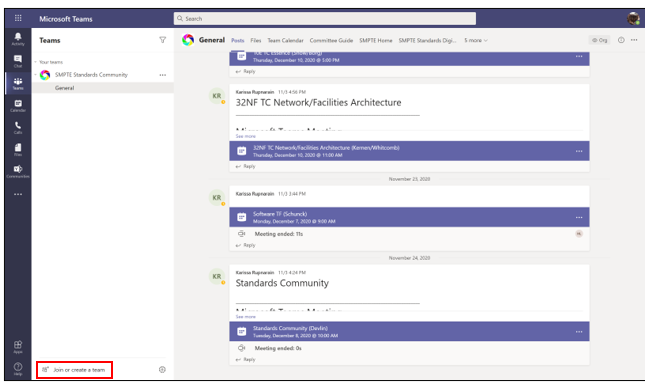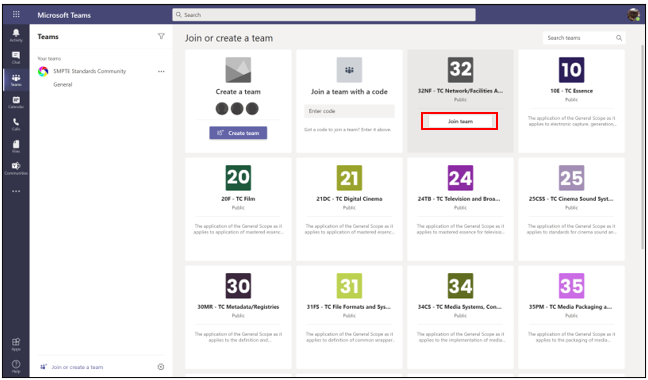 Once you were added to the SMPTE Microsoft 365 account you were also added to the SMPTE Standards Community (SC) team. It is the only team you do not have to join. Your initial view in teams may look like what is shown on the screen grab below.