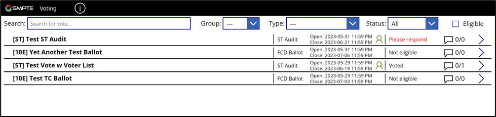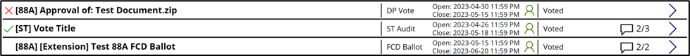 On the list of all votes, you will be provided with the vote title, the status of the vote (green check mark for pass and red X for no pass), the voting group, the type of vote, the open and close date, your eligibility status (indicated by the green person icon), your vote status (indication if you already voted or not), and the status of comments (example 2/3 means 3 comments with 2 comments resolved). An extension of a vote or ballot will also be indicated in this row. The list can be filtered by a search string, a group, vote type, status, or user eligibility to participate. You can click the title or the arrow on the right of the row to access the vote, ballot or audit.
