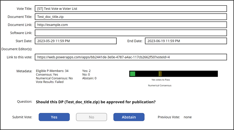 By clicking the “Vote” button on the vote screen, you are taken to the vote submission screen. This screen looks very similar to the vote screen. At the bottom you are presented with the question and the appropriate vote options. Selecting one will take you back to the vote screen and depending on your vote, will create either a green (Yes), blue (Abstain) or red (N0) indicator block in the notification bar in the middle to the right of the screen. A “No” vote requires you to submit a comment first before you can vote no.