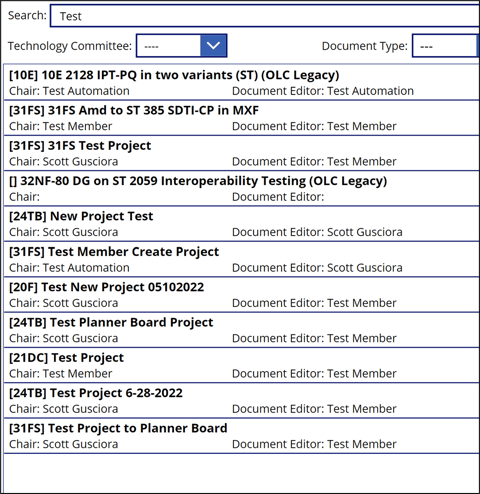 Entering text in the search box will filter all projects with those characters present in their name, assigned chair, or assigned document editor. This text search is NOT case sensitive.
