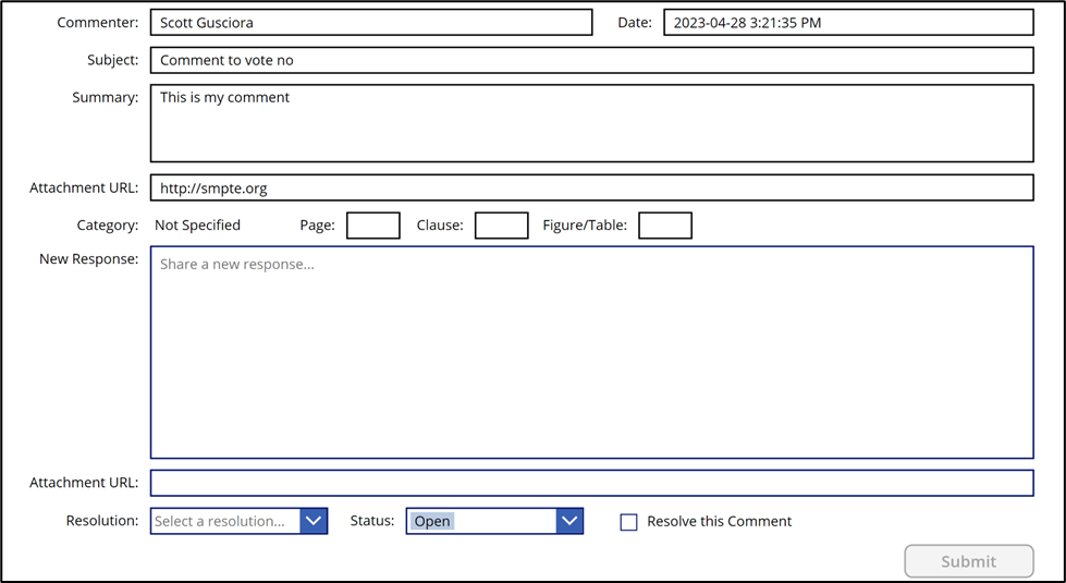 The response submission screen contains space for a response, an attachment, and the ability to update the resolution, status, or state. If the comment is marked resolved, no additional responses will be allowed. If this is done in error, please contact standards-support@smpte.org to get the response fixed.