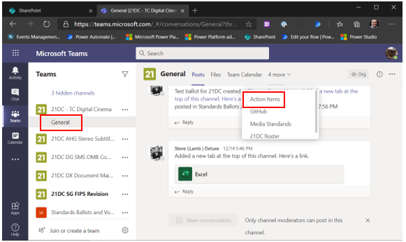 - To access an action item and may be respond to it you have go to the team the action item belongs to. Click on the “General” channel and the on the “Action Items” tab. This tab may be hidden in the “more” menu depending on the size of your browser windows.