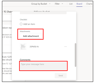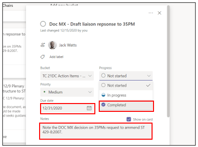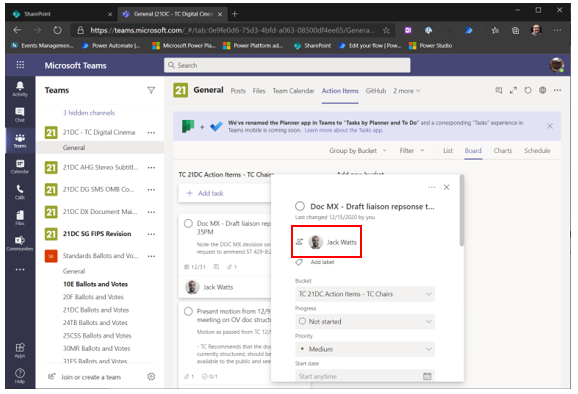 - As previously explained, action items are maintained through Microsoft Planner. Each card on the Planner board represents an action item with information about it. It usually contains a start date but most importantly the person it is assigned to
