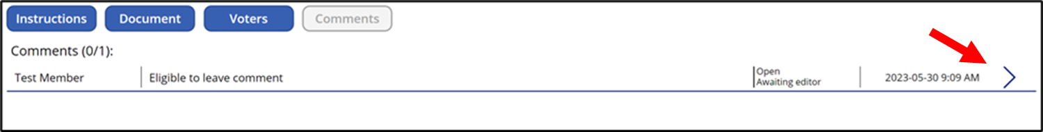When you switch to the Comments tab on the vote screen you will see a list of comments (assuming that comments were submitted). Click on the arrow on the right in a comment row of the comment list to access the comment screen.