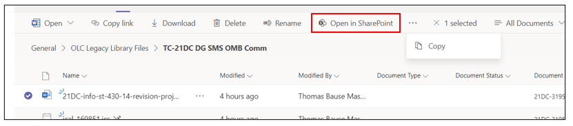 - Click on the “Open in SharePoint” link to open the same Teams folder view in SharePoint