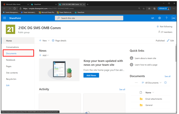 - The SharePoint site for the team gives you many options. For now we are only interested in documents. Click “Documents” on the left.