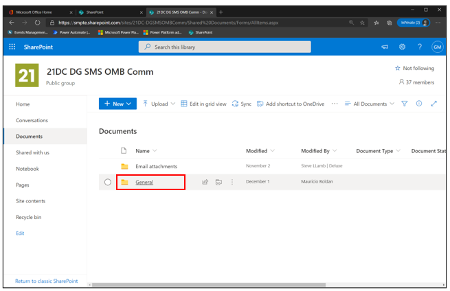 - The new screen will show you the channels for your team SharePoint site. We usually have one the “General” channel. Click on the :General” channel.