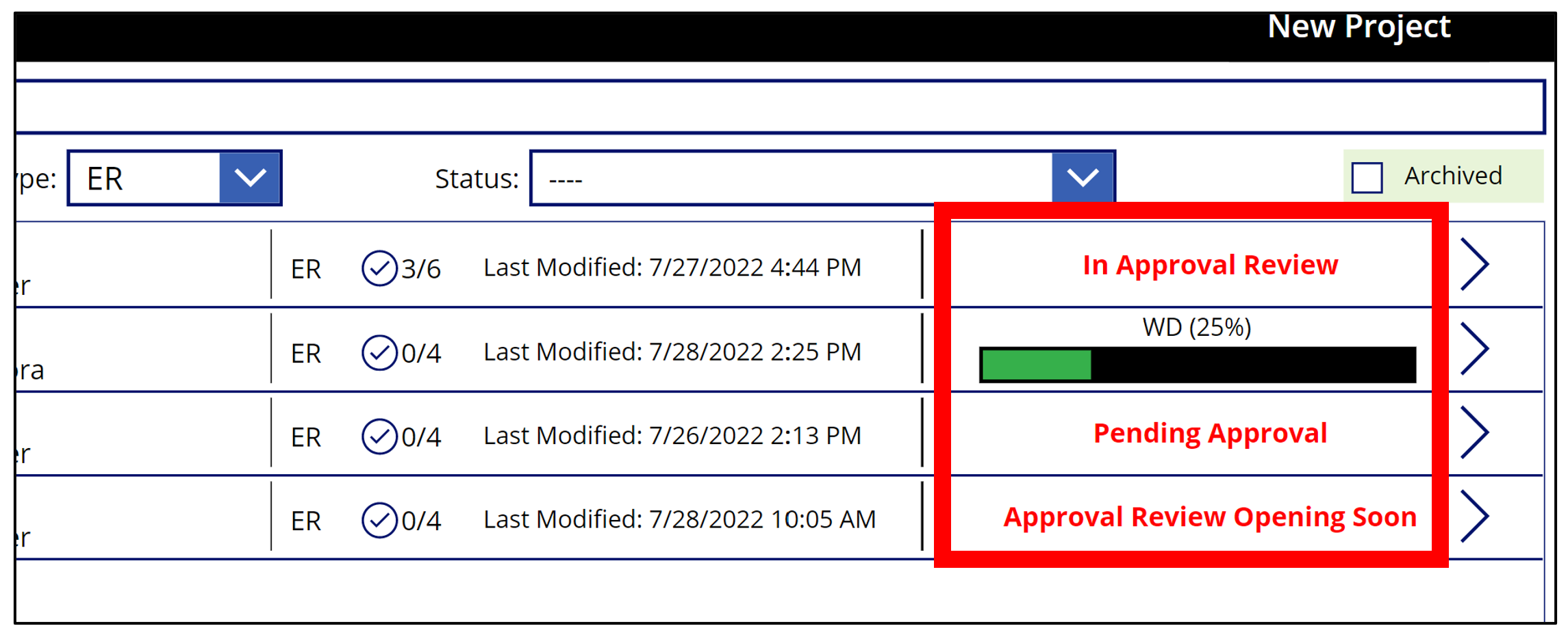 Projects must be approved by the corresponding Technology Committee and the Standards Committee. Approvals are conducted over a period of two weeks and start automatically at 11:59 PM ET on the specified start date. Emails are distributed throughout the approval period to remind members it is occurring. If the review dates are changed, the emails will still be sent corresponding to the original specified timeframe. The approval status for a project can be changed by checking the “Approved” or “Archived” checkbox on its project page. The approval status displays “Approval Review Opening Soon” when the current time is prior to the review start date, “In Approval Review” when the current time is between the review start and end date, and “Pending Approval” if the current time is after the review end date and neither the “Approved” nor “Archived” checkbox is checked.