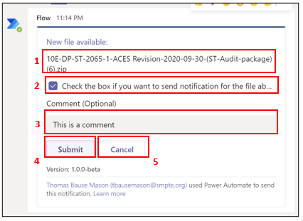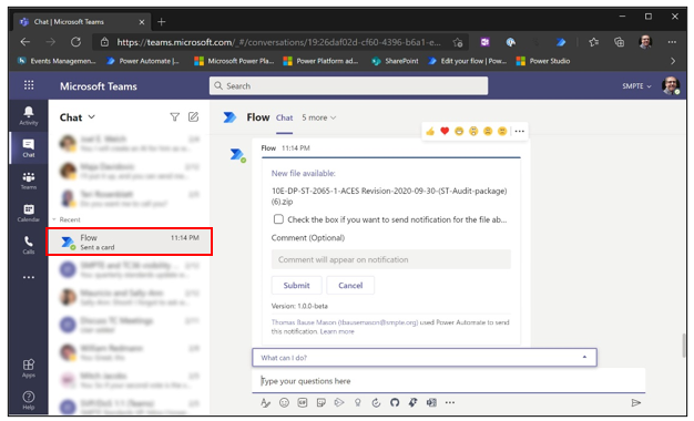 - There is a delay of up to a minute between when the file is uploaded and when the chat message is received. The card sender is called “Flow”.