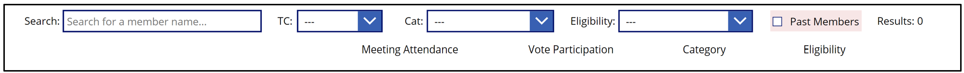 Additional fields such as search, cat (membership category), eligibility, and past members can be used to filter or provide additional results.