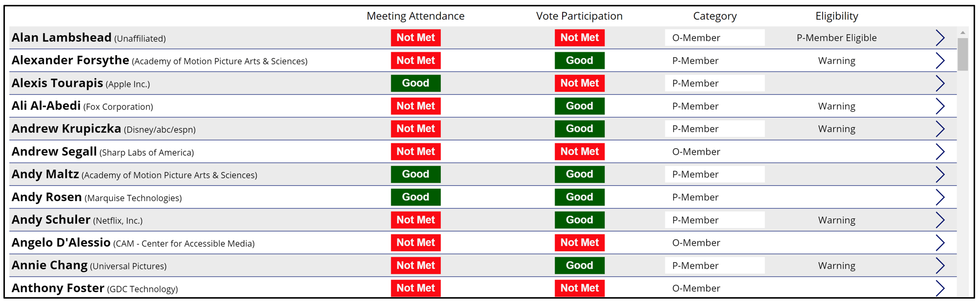The list will display the member’s name, current affiliation tied to their SMPTE membership, their aggregated meeting attendance status, their aggregated vote participation status, their membership category (O-Member or P-Member), and eligibility status.