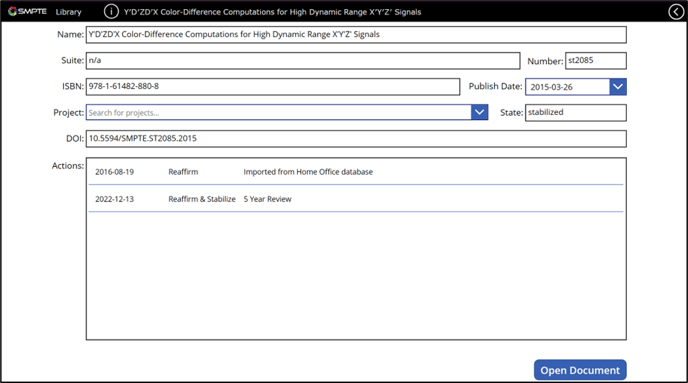 Clicking on the arrow symbol on the right side of a document row in the document list on the Library App main screen will bring you to the Document Metadata View. The document metadata provides information regarding to its publication. Some fields of the document metadata may not have data assigned or synchronized to it if the document is new. The screen shows the document name, suite, number, ISBN, publication date, any associated projects (must be manually updated), state, DOI, and then a list of actions that have been taken on the document. The actions are used to determine review status. The publish date can be selected to view metadata for a different version of the same document. Clicking the ‘Open Document’ button will take the user directly to the document.