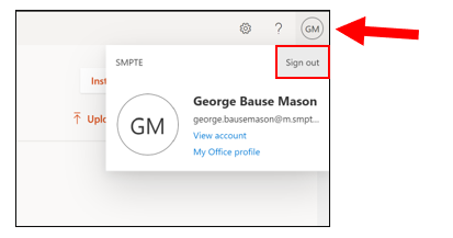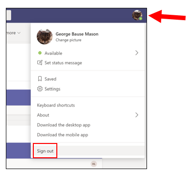 Logout (All) To log out of an application go to the top right of the webpage and click on your profile image and then on “Sign out”. The behavior is similar in all MS 365 online apps www.office.com teams.microsoft.com