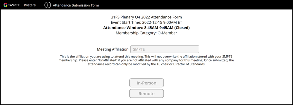 TC members will be able to provide their affiliation on a per-meeting basis when they submit their attendance. Attendance is submitted by pressing the In-Person or Remote buttons below. If your attendance was recorded, a message will appear. The attendance window opens15 minutes before the start of the meeting and closes 15 minutes after the end of the pre-determined meeting time. If the meeting exceeds the allotted time, the attendance window will not change.