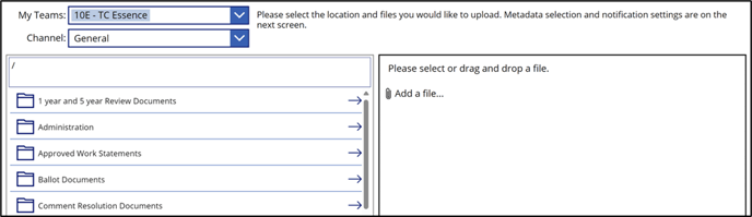 On this screen is a dropdown of all the Microsoft teams you are a member of. Select the corresponding team and channel you would like to upload file(s) to. On the left side of the screen will be a folder picker to locate the desired subfolder. On the right you can select up to 5 files to upload. They will all upload to the same location. Upon selecting a valid file to upload, the Next button will be available. Clicking it will bring you to the metadata annotation screen.