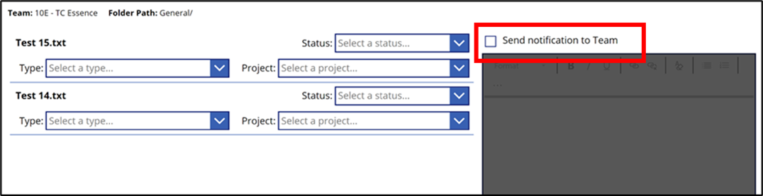 On this screen you can select the appropriate metadata for each file. These are currently type, status and project. The project dropdown will let you associate a document to a specific project.