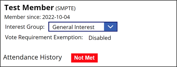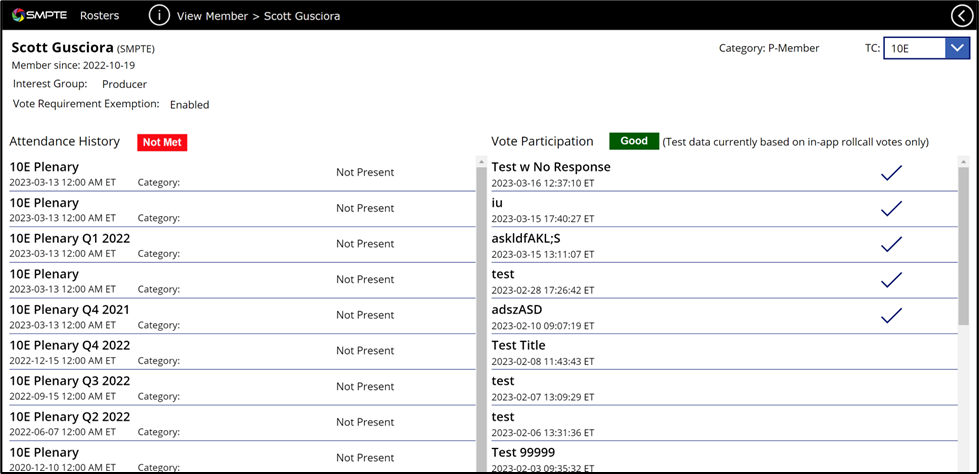 On a member’s activity, you can see their name, affiliation, the date the member joined the TC (subject to lapse in membership or Microsoft account activity), the membership category, the interest group, and the vote requirement exemption field. The interest group is a Standards OM defined field. The vote requirement exemption is used to allow users to participate in votes when they do not currently meet the criteria to participate. A user’s TC memberships can be viewed by using the TC dropdown on the top right. Selecting another TC will display that user’s activity relative to that TC on the same page.