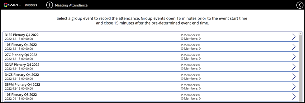 Upon pressing the Meeting Attendance button in the navigation panel, users will be brought to the list of the last 3 sets of TC meetings. This list is limited for sizing, but older data is retained. Using an arrow on the right will take the user to the attendance for that TC meeting.