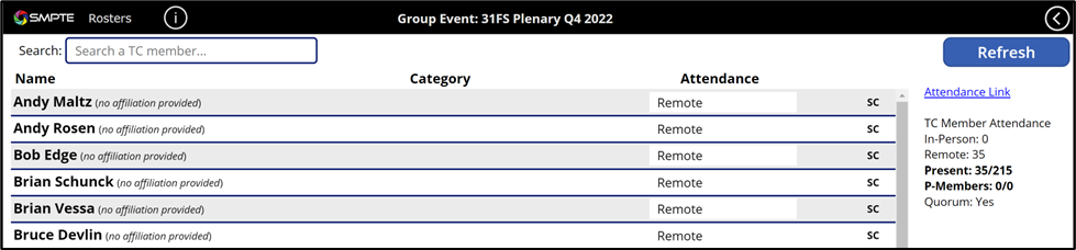 The attendance list consists of the member’s name, meeting affiliation, membership category, attendance, and if they are an SC or TC member. Quorum, the attendance recording link, and other statistics related to attendance are available on the right. The Refresh button is used to reload the data presented. Available at the bottom is a list of all users, filterable by TC member only (this is more useful for TC chairs who can edit attendance from this screen).