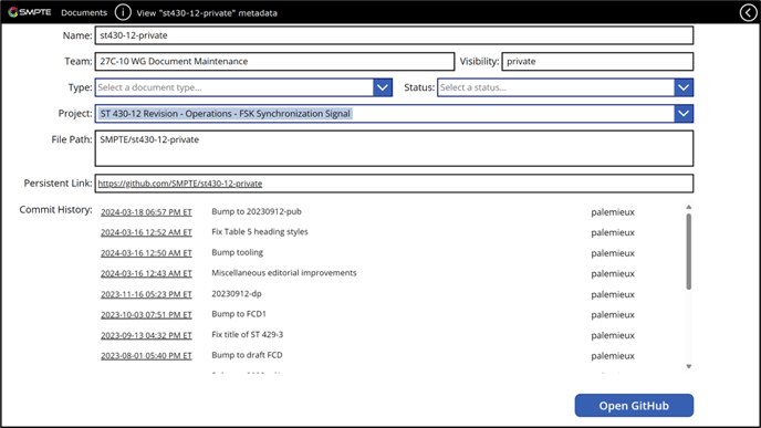 Viewing a document provides metadata for the file or repository you are viewing. The app will show you the name, associated Microsoft team, if a repository the visibility, if a SharePoint file the Doc ID, the document type, the document status, the project, the file path, a persistent link, and the commit or version history. Buttons to access the GitHub repository or download or open the SharePoint file or location are also available.