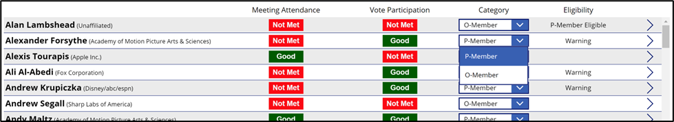 From the Home screen, the TC chair can modify any TC member’s membership category using the dropdowns on the list.