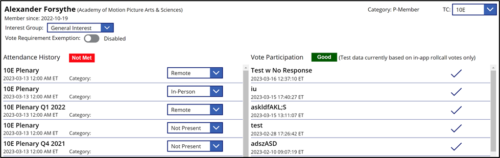 The TC chair can also modify interest group, vote requirement exemption, and individual meeting attendance on the member activity screen.
