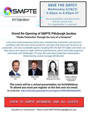 April 2021 Event Notice-Reminder-FINAL-1Learn how media production teams have retooled their production and technical workflows with the onset of th pandemic, and what that means for the future of production. Join local roundtable experts including NEP, the Pgh Film Office and others, as they discuss the impact to major national entertainment, sports and studio programs, and locally with Pittsburgh's TV news, film and video production communities; Moderated by section manager Bill Bennett.