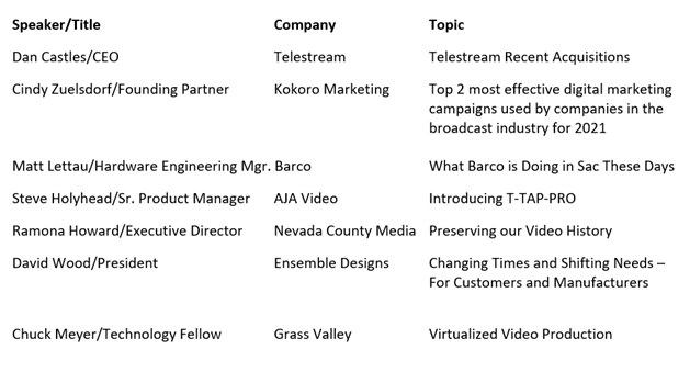 Each speaker will spend five minutes presenting their topic, which will be followed by a five minute Q&A. The meeting is expected to run approximately 70-80 minutes. See the line-up below: