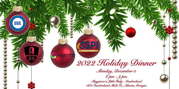 Please join us for this Members* only event on Monday, December 5 for the 17th Annual Holiday Dinner presented by the Atlanta Area chapters of the AES, SBE, SMPTE and SSPI-SE at Maggiano's Little Italy for dinner, dessert and lots of great door prizes provided by many of your favorite industry professionals including: