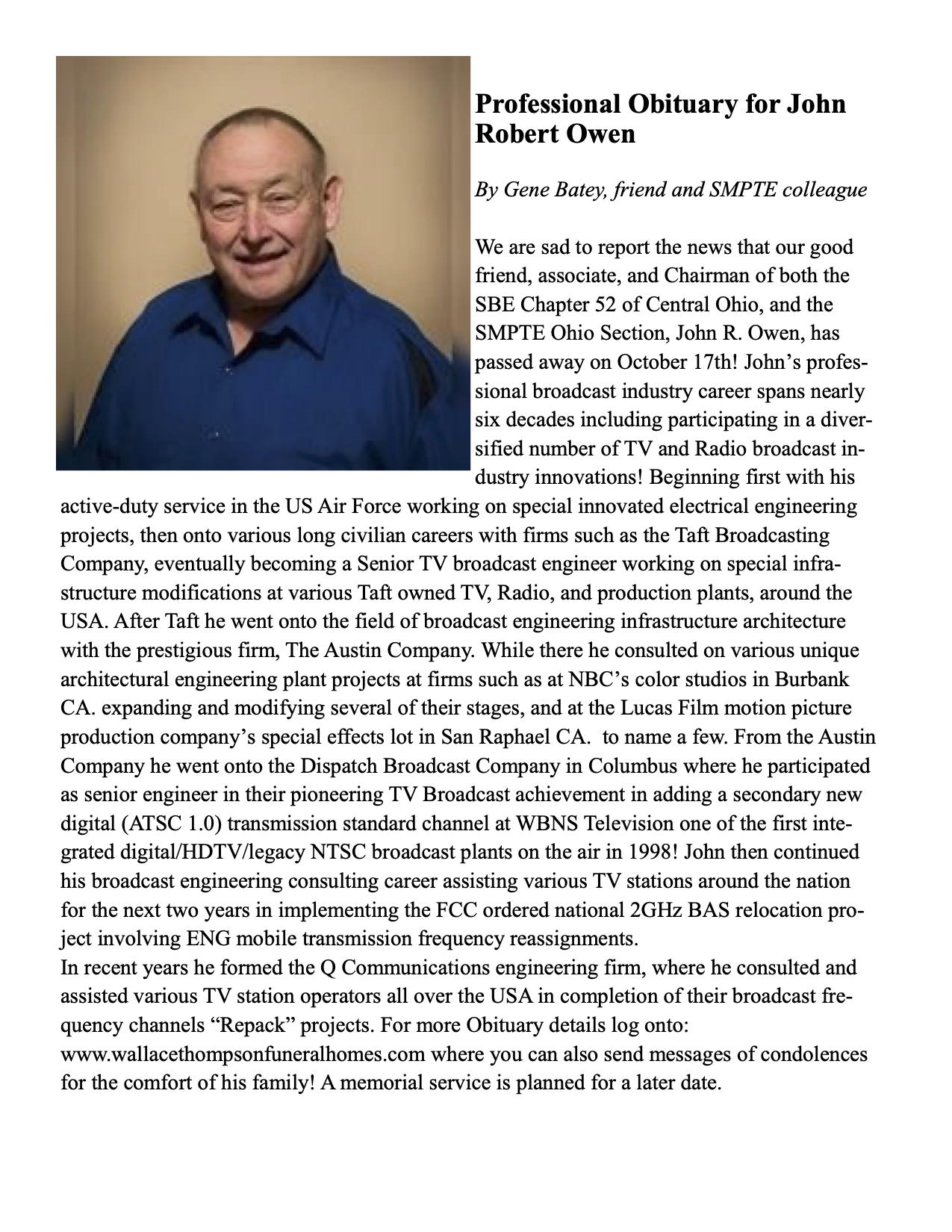 Summer Season Greetings to everyone! Our next Ohio Section combined meeting along with the Central Ohio SBE Chapter 52, will take place on Friday, July 26th, 2024 at the WCMH Television Studio Plant located at, 3165 Olentangy River Road, Columbus OH 43202.